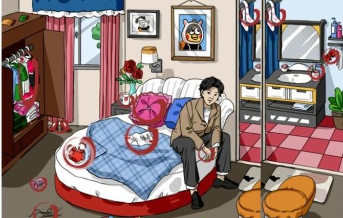 这一关我们需要在宿舍找到住过女生的12个证据,答案是:情书、长发、皮筋、裙子、高跟鞋、枕头、玫瑰花、口红印、长筒袜、发髻、情侣牙刷、洗面奶。