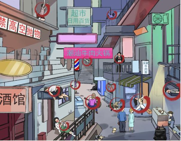 1、醉倒街头这一关我们需要在街头找到12个醉酒的人,点击禁止高空抛物的牌子可以出现一个醉酒的人。