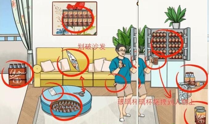 1、这一关我们需要在房间找到隐藏的生可乐,剪刀可以使用,比如进入游戏点击壁画可以发现可乐,打开冰箱可以发现可乐。