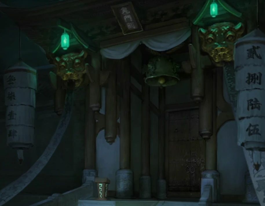 过河后失去了珠子,不过右边的石灯上面还有个珠子拿走吧,左边的石灯旁边拿到锤子,中间的桌子上拿到毛笔,两边的灯笼肯定是线索了,左边3714右边2856是连续的数字首先考虑顺序,所以按照左右左左右右左右的顺序点击门环后门......并没有打开~而是掉下来一个大钟,用锤子敲钟后查看中间的台子发现多了一本通关文牒,上面是个从没出现过的名字,这个名字就是我们的大boss啦~第二部肯定还会出现的。