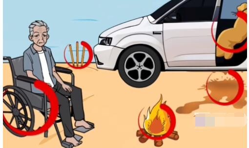 4、最后将男人放在轮椅,妻子放在帆船上,点击沉船、三根香、车漏油了、麻袋、篝火、轮椅