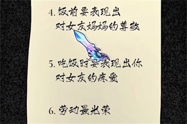2、女友家中点击纸条获得规则后把筷子拖到碗上把虾给女友洗完盘子后进入屋里。