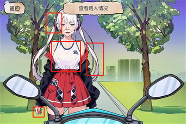 6、离开小区会遇见老太婆,点击耳机、双马尾、身上的衣服还有红色手指甲。