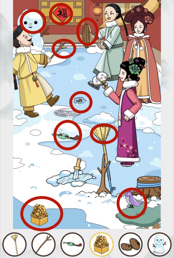 需要将扇子放在红衣女子的手上,再点击扫把。